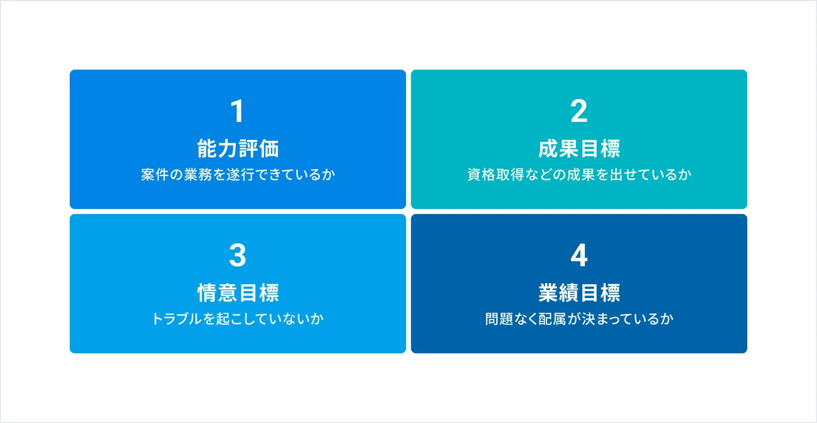 エンジニアがお客様先で働いていると、上司が部下の働きぶりを直接見る機会は多くありません。そこでソシアスでは年に2回、営業がエンジニアの配属先のお客様に対してアンケートを実施し、以下のような観点を確認しています。