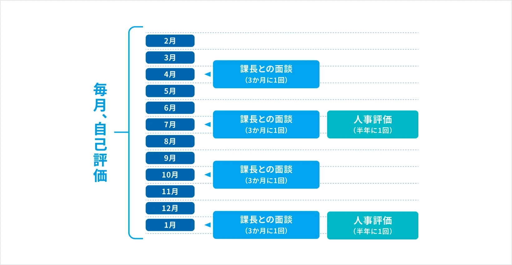 3か月ごとに課長と1対1の面談を実施し、日々の取り組みや課題についてすり合わせます。この面談は、キャリア相談や業務での悩み共有の場でもあり、評価・昇給に関するコミュニケーションだけが目的ではありません。