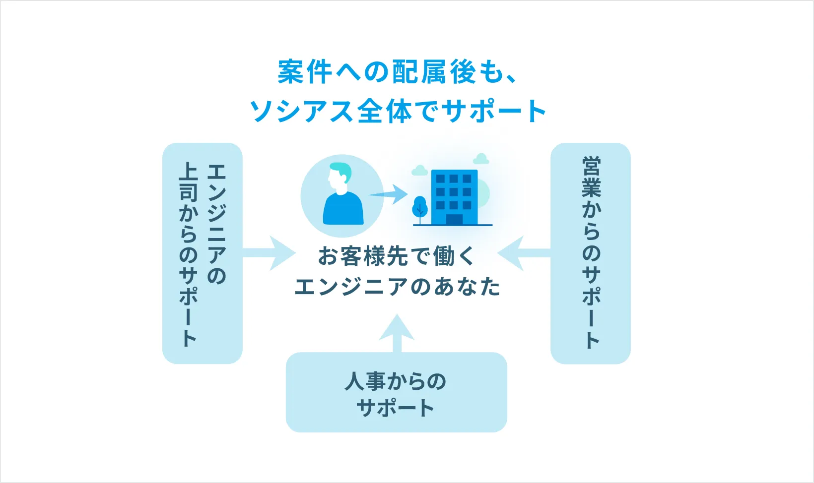 ソシアスでは、自らもお客様先での業務を経験してきたエンジニアが、上司として部下のエンジニアをサポートしています。さらに営業や人事も一丸となってエンジニアを支えます。