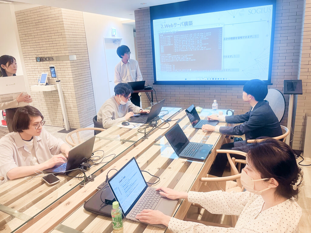 新卒や未経験の方には、入社後1か月間の集合研修があります。ITの基礎知識やビジネスマナーに加え、仮想環境を使った実践的な技術演習まで、現場で役立つ内容をしっかり学べます。元々エンジニアとして働いていたり、外部でも講師経験を持っていたりするソシアスの社員が教えるため、わからないことがあれば、すぐ気軽に聞ける安心感があります。