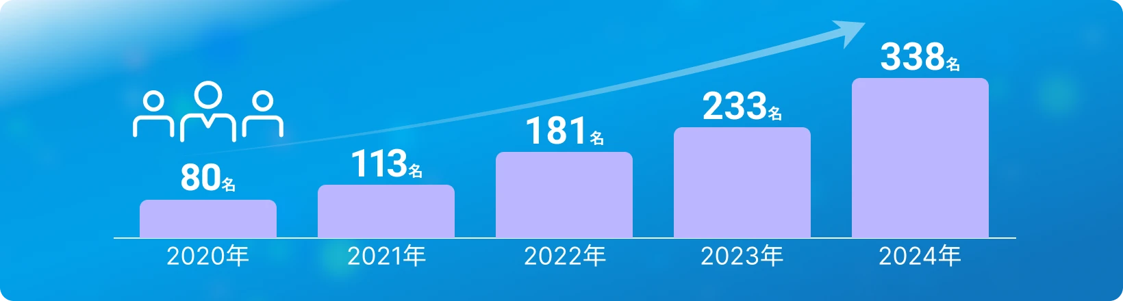 2020年頃までは、主にリファラル採用(社員の紹介による採用)で、ゆるやかに増員していました。そこから一般採用を強化し、数年で一気に組織を拡大。2025年頃からは、組織体制を整えるため、また少し採用のペースを落ち着かせています。