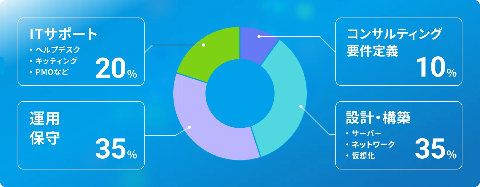 コンサルティングや設計・構築など高度なスキルが求められる上流工程の業務から、経験が浅い方でも挑戦しやすい運用保守やITサポート系の作業まで、幅広い内容の案件があります。エンジニア一人ひとりの現在のスキルや目指す方向性に合わせて、最適な業務をお任せしています。