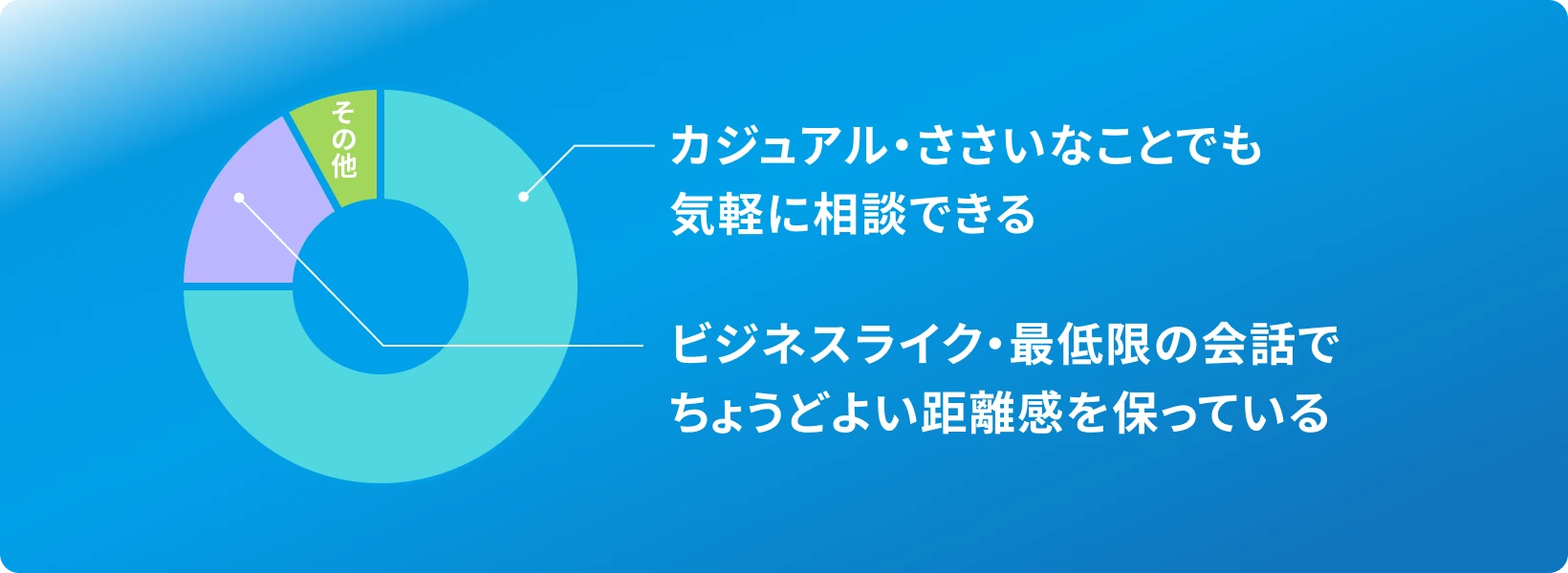 同じく社員向けのアンケートによると、コミュニケーションの距離感は「ささいなことでも気軽に相談できる」という回答が大多数であり、異なるお客様先で働いていて物理的には離れていても、チャットなどでお互いに声をかけやすい関係性が伺えます。ただし、人によっては近すぎず・遠すぎずの、それぞれにとって心地よい距離感を上手くコントロールしている様子も見られます。