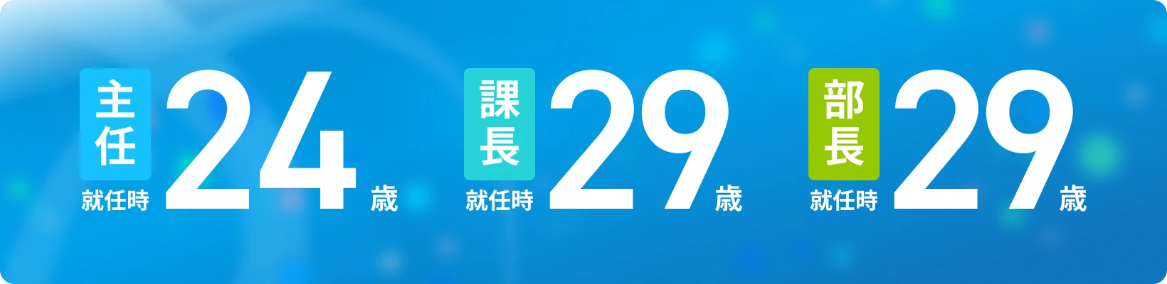 ソシアスでは、役職に就く際に年齢や社歴の制限はありません。実際に、20代で部長に就任した社員もいます。真面目に努力して、自ら手を挙げた人がチャンスを掴める環境です。