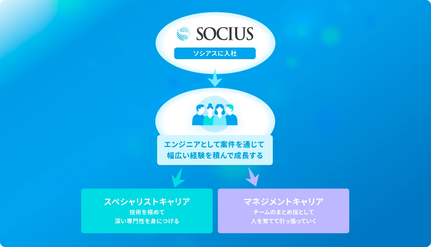 エンジニアとして経験を積んでいった先には、技術を極めるスペシャリストの道と、チームをまとめるマネジメントの道、どちらも選ぶことができます。中には、エンジニアから営業や人事にキャリアチェンジした社員もいます。