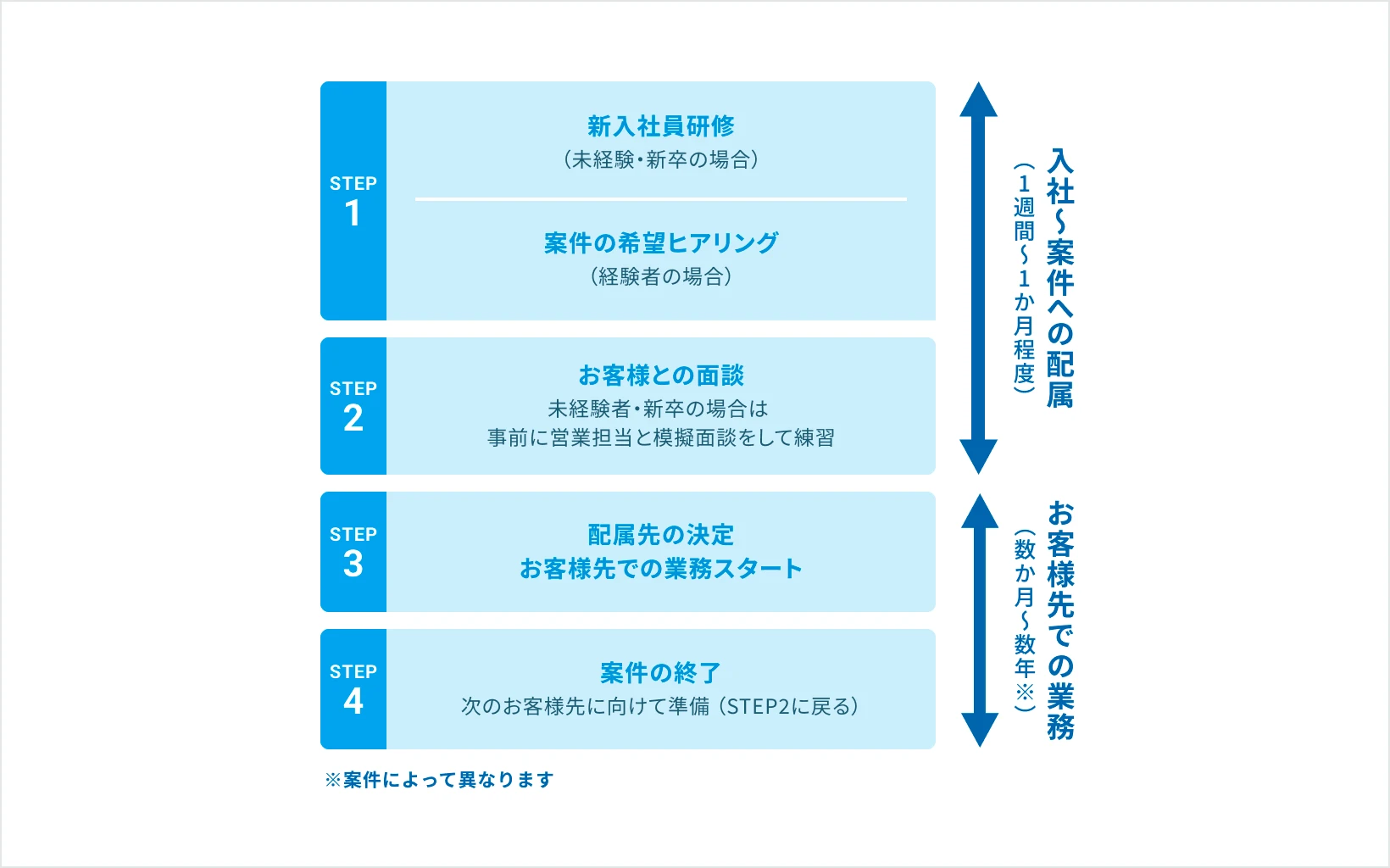 一定の期間が経ったら案件は終了し、また次の配属に向けて動きます。案件の終了が近づくと、営業がお客様から事前に連絡を受け、上司を通じてエンジニア本人にも速やかに共有されます。